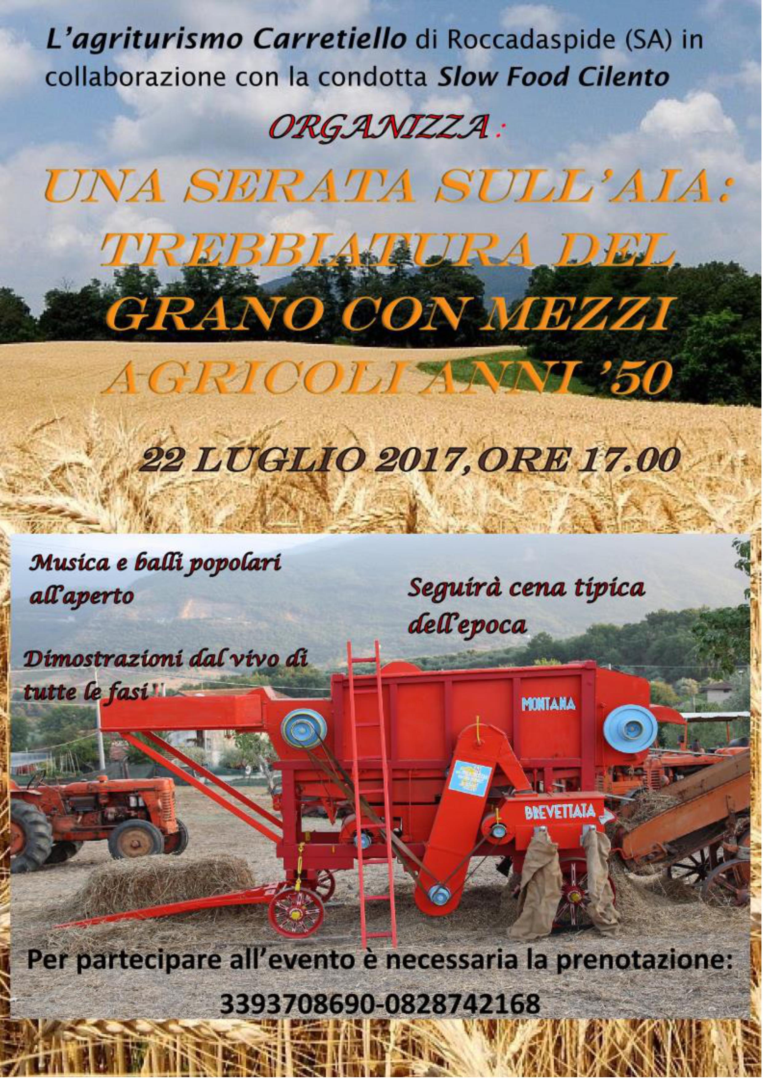 Appuntamento per sabato 22 luglio a partire dalle ore 17 presso l’Agriturismo Carretiello a Roccadaspide (SA): dimostrazione dal vivo di tutte le fasi della trebbiatura, musica e balli popolari all’aperto e a seguire cena tipica dell’epoca.